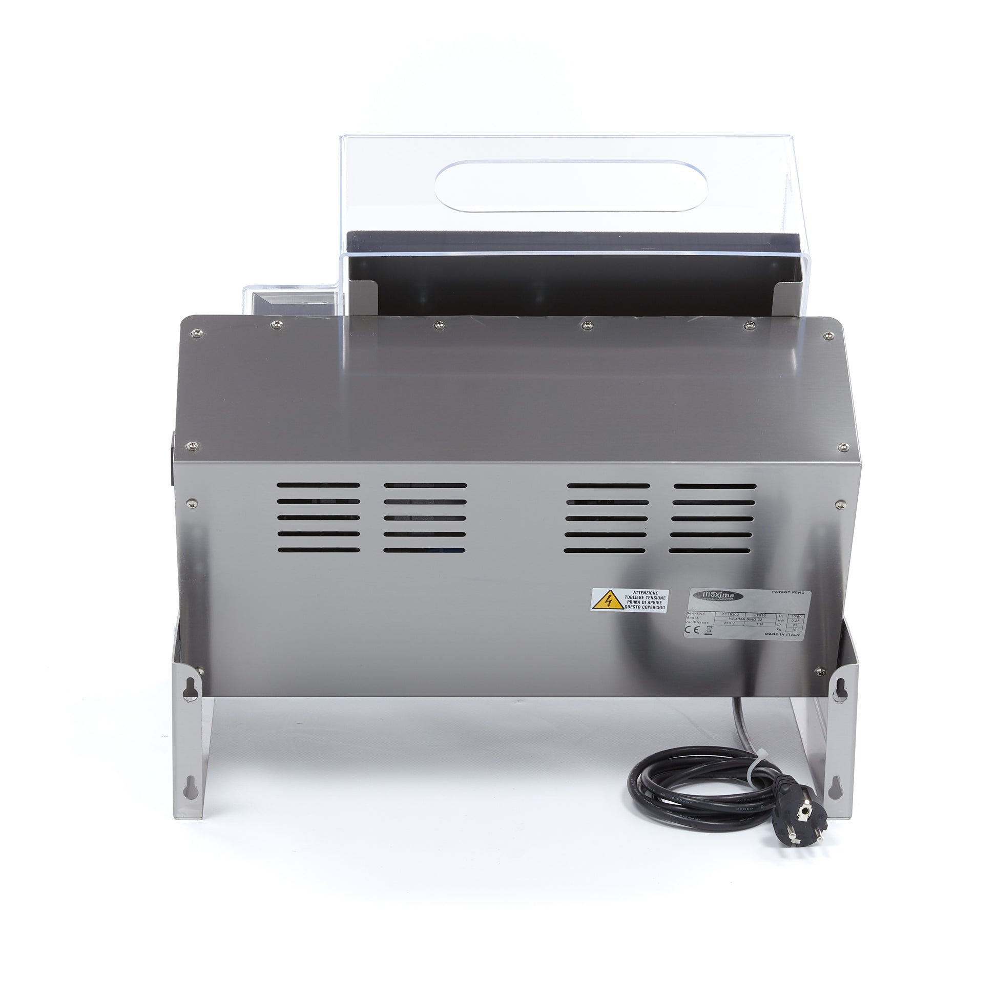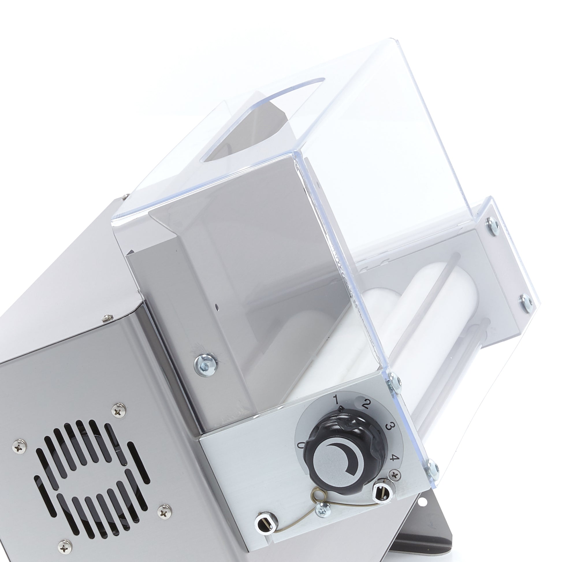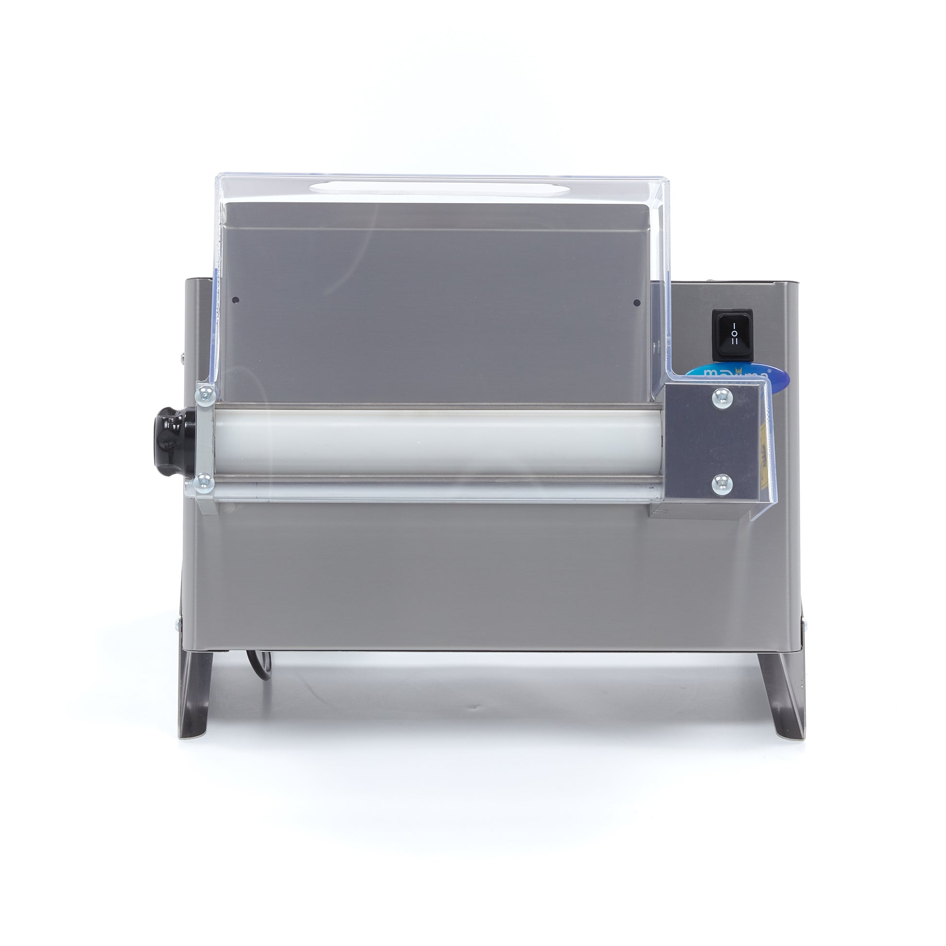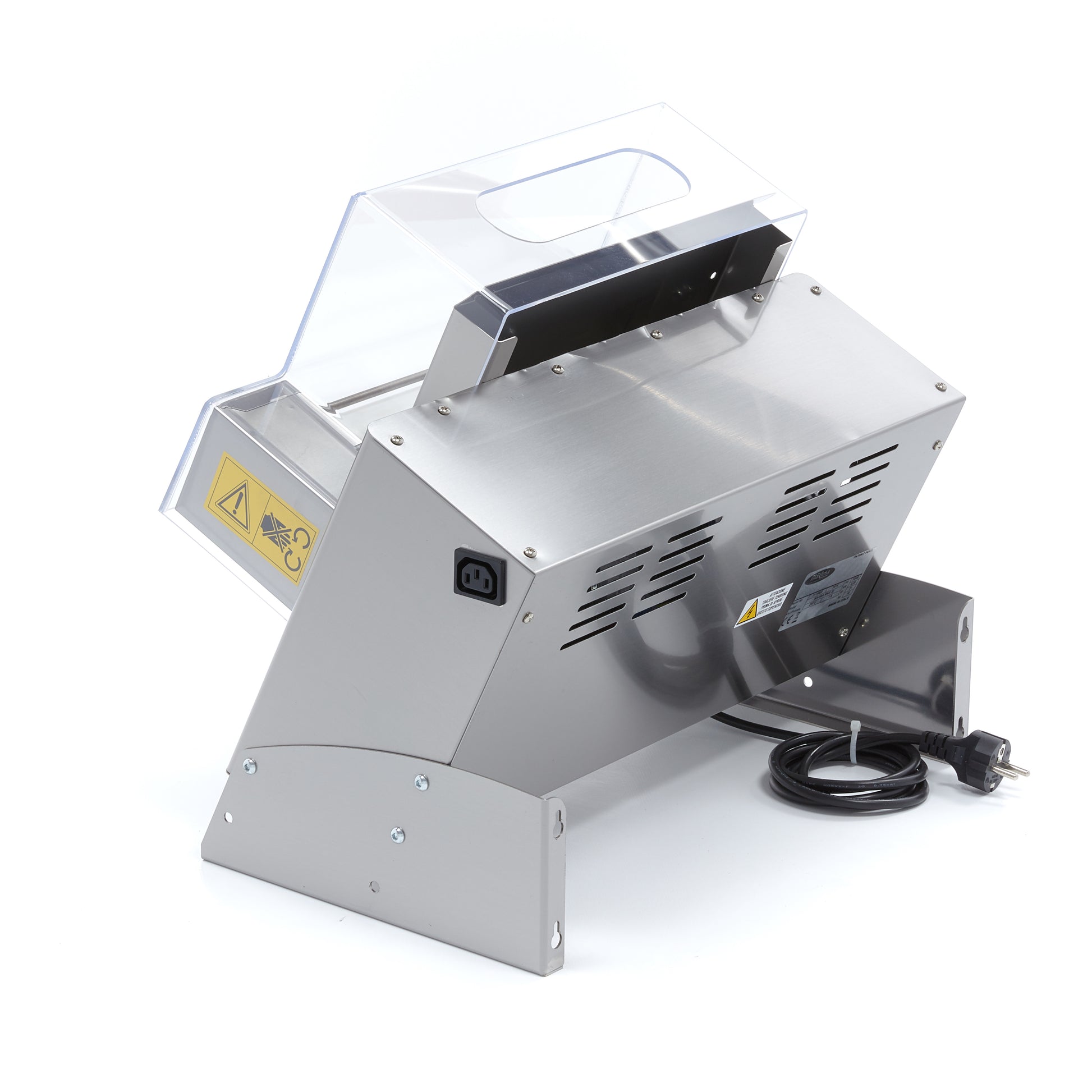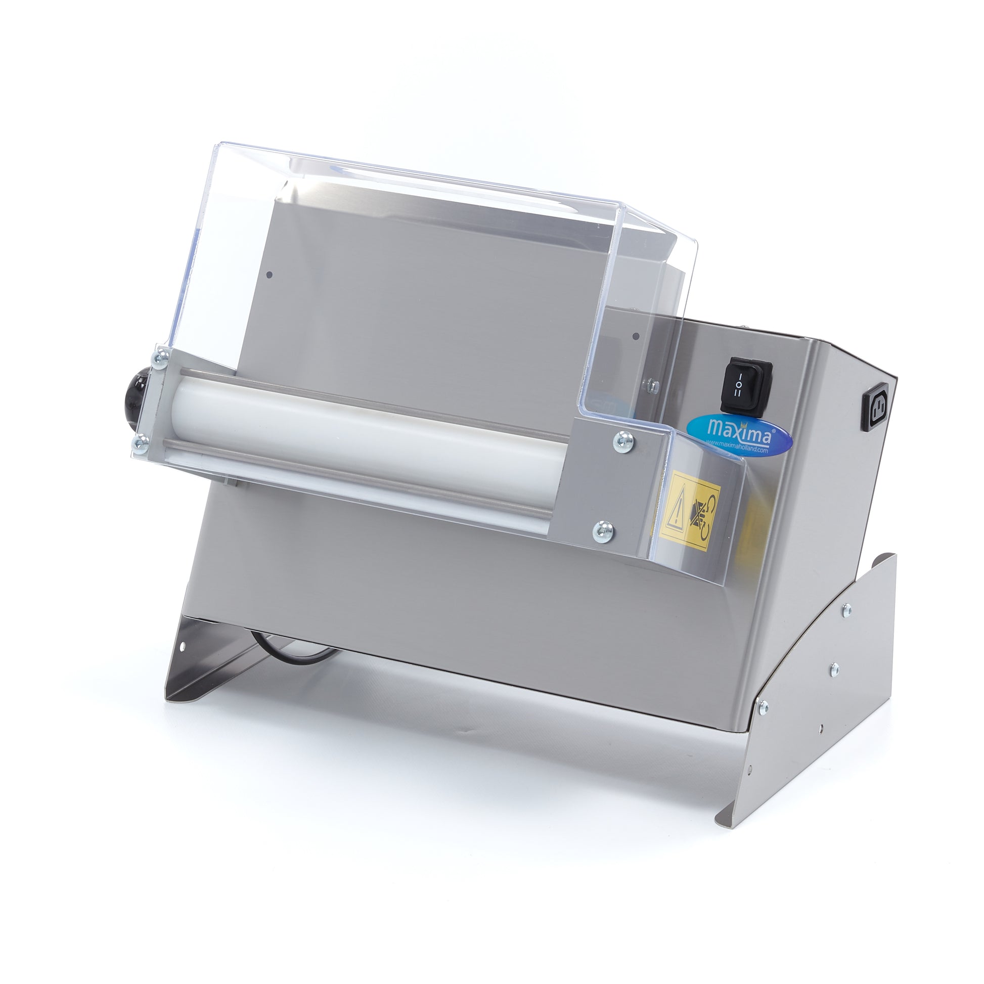 With the powerful drive and strong motor, you can quickly and easily roll between 80 and 210g of dough at a time. The rolling pin is equipped with one speed. Thanks to the transparent plastic protective cover and the safety switch, this professional pizza rolling pin is always safe to work with. The appliance stands on two wide stainless steel feet and the housing is made entirely from stainless steel. When working with food, good hygiene is very important. That is why it's important to clean the rolling pin regularly. The parts are removable and can be cleaned with a dry cloth. Do not use water. This can cause flour residues to stick to the machine.
