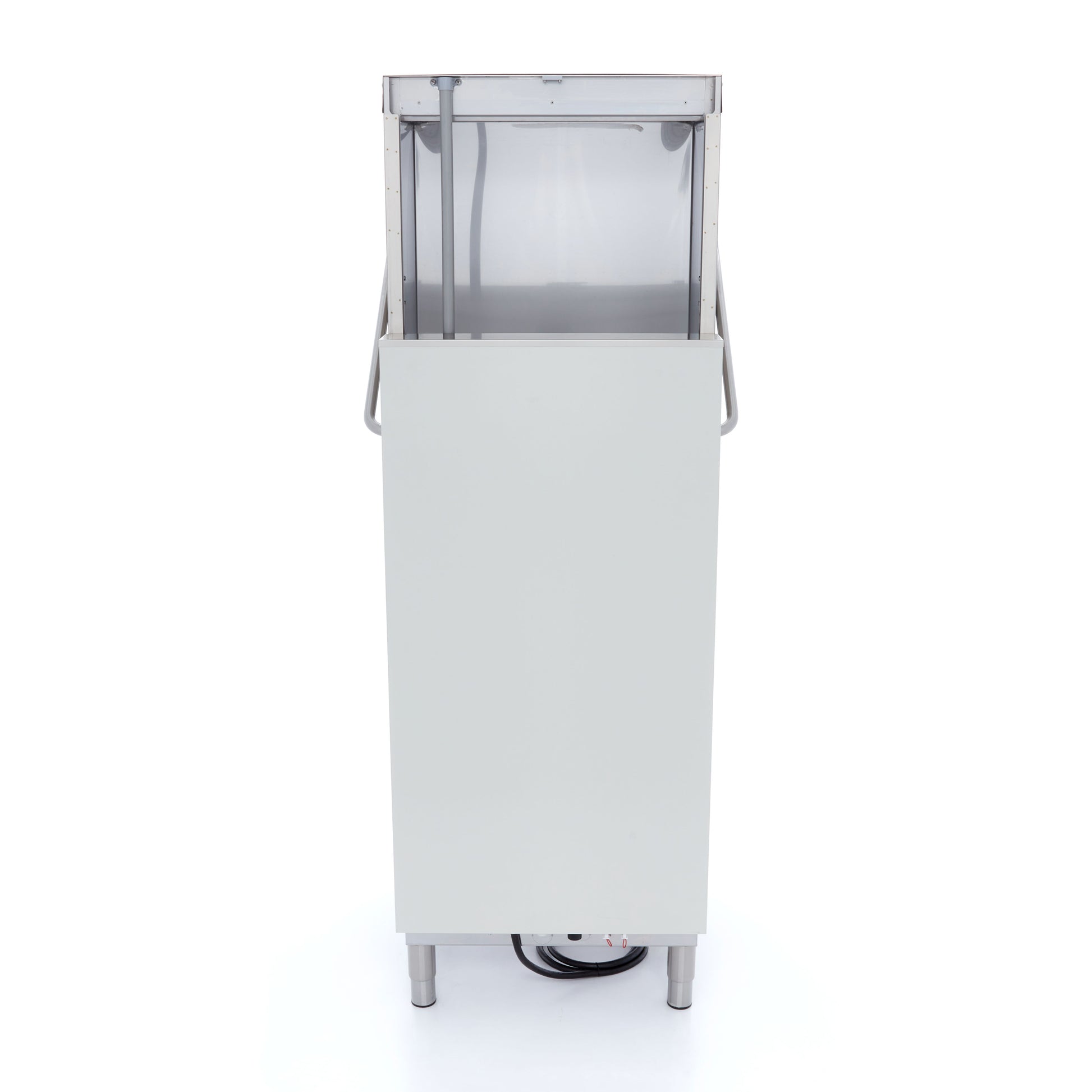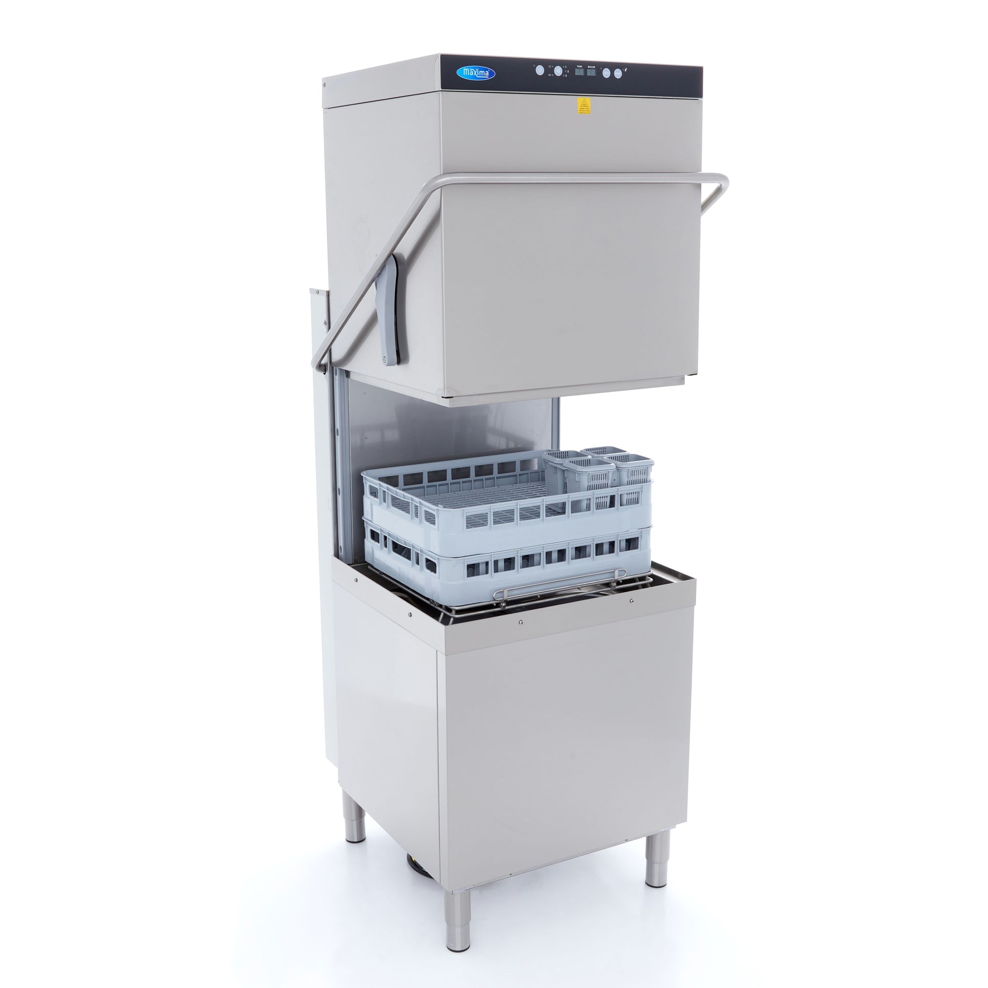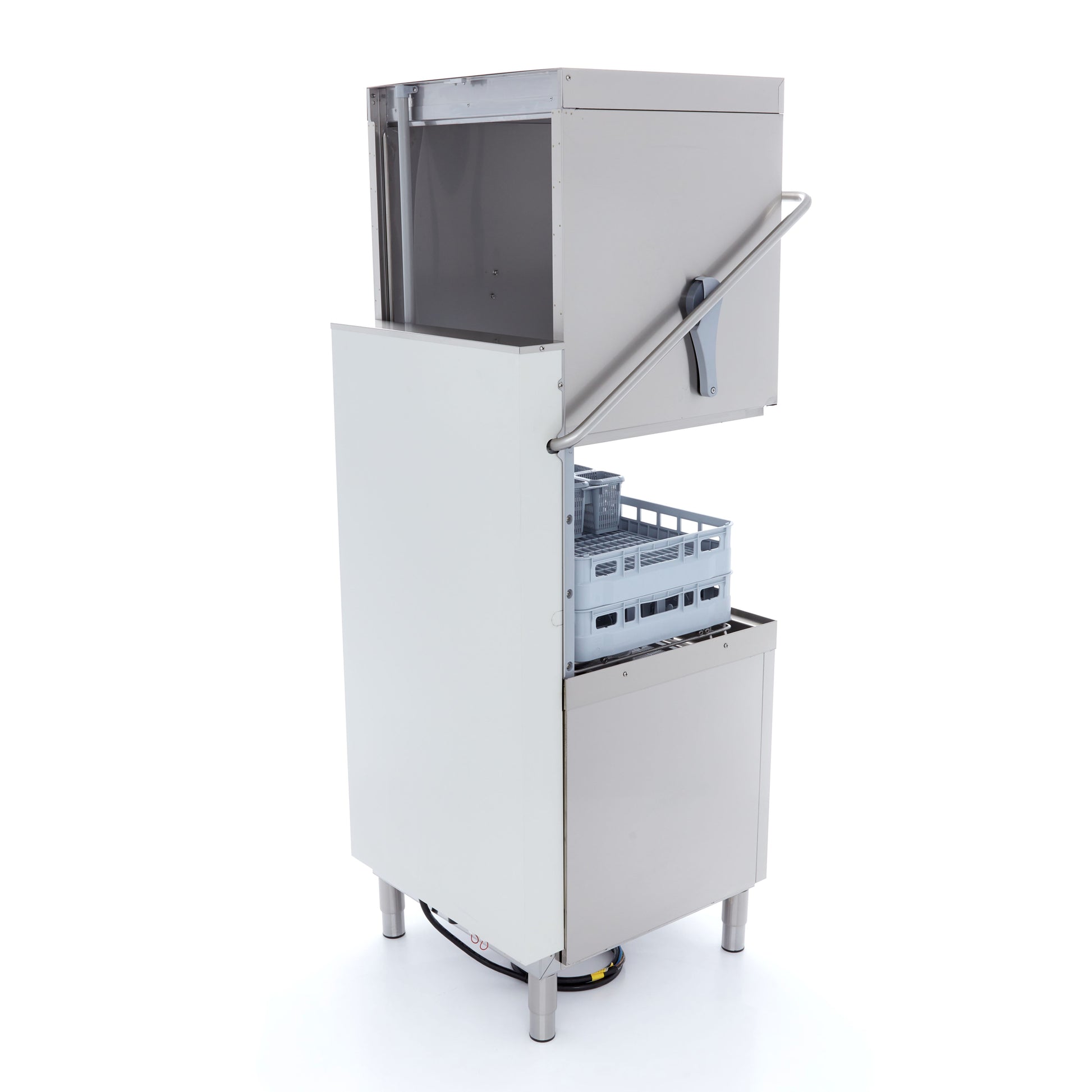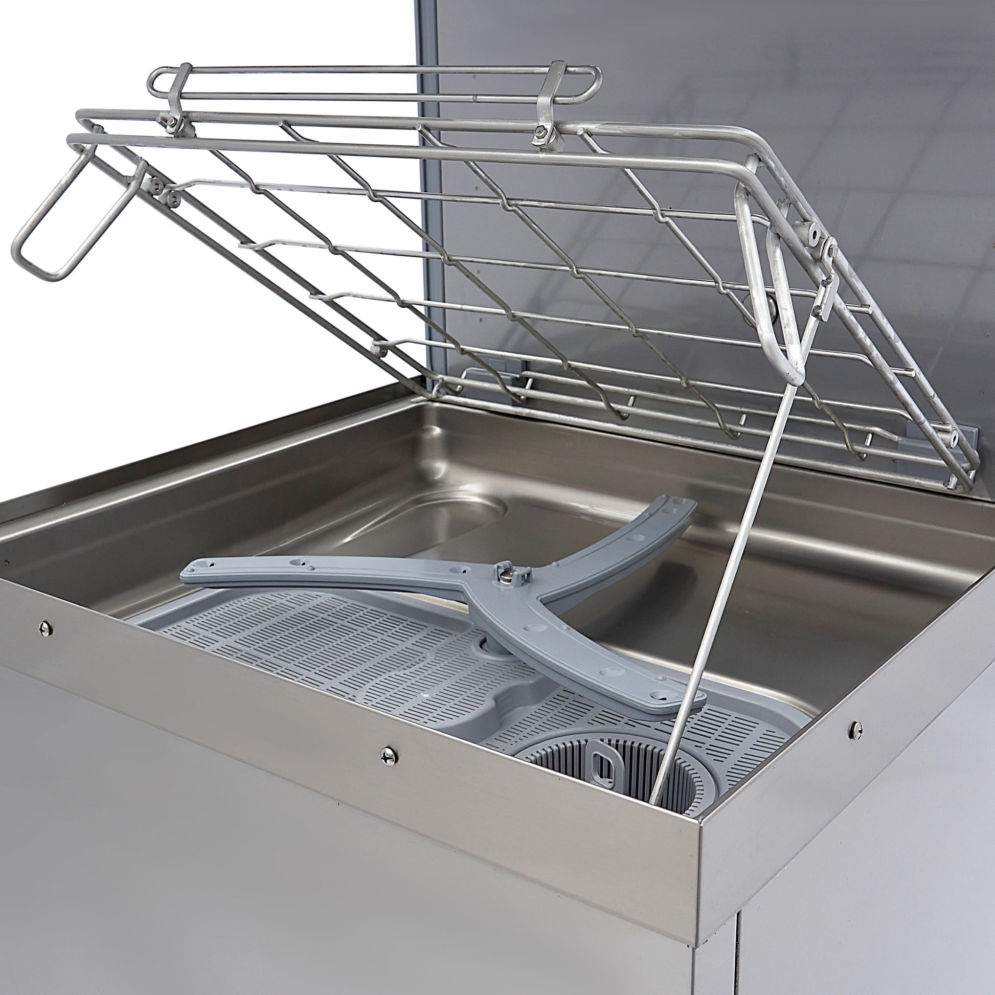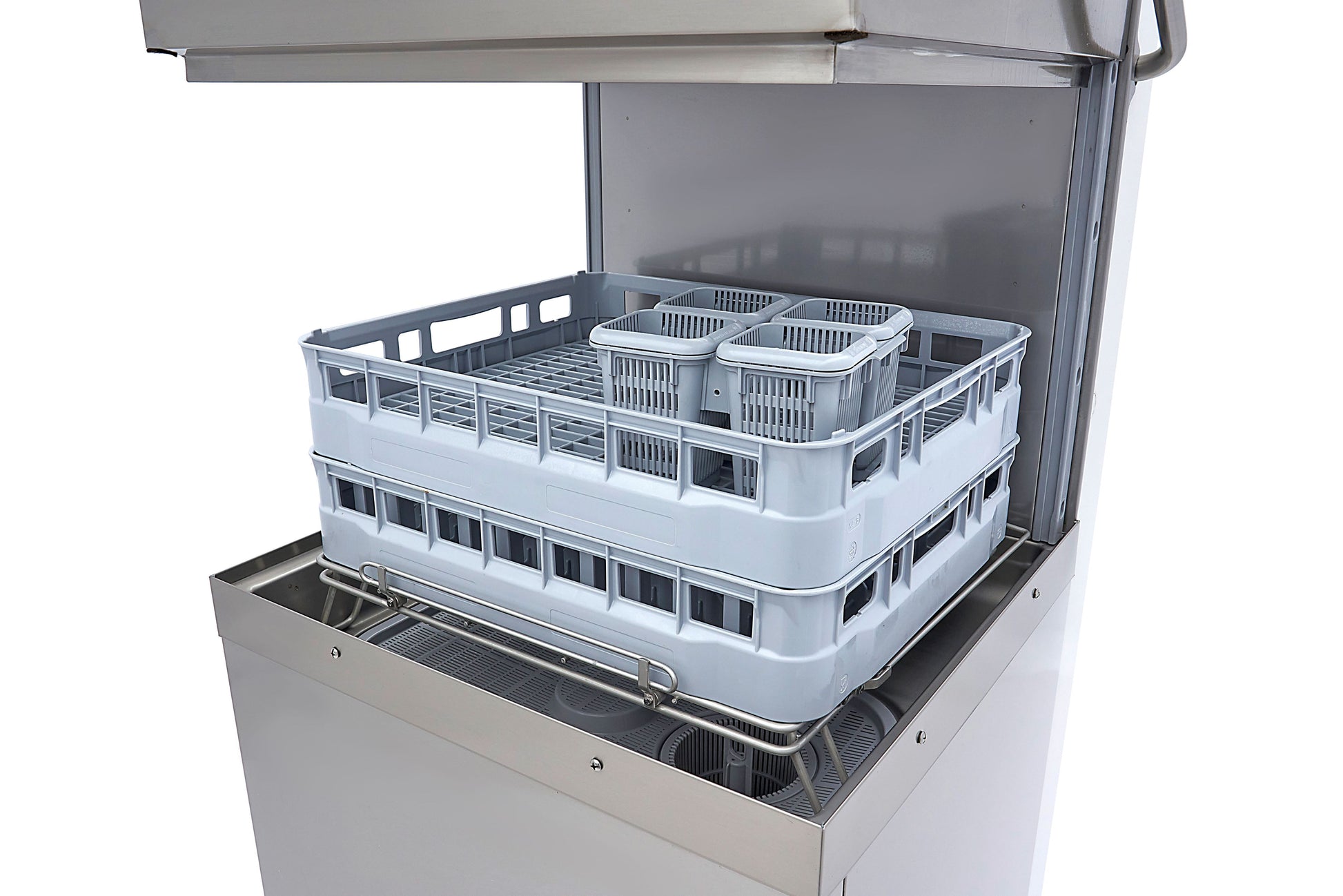 The pass through dishwasher has been made entirely from stainless steel, which makes it very quick and easy to clean. The smooth surfaces can be wiped down with a damp cloth. The wash arms on the inside are made from special ABS and can be cleaned with a cloth and water. The dishwasher is equipped with rinse aid and soap pumps. It is important to note that the rinse aid and soap pumps can only take liquid detergent. No drain pump is included because the water runs off naturally.