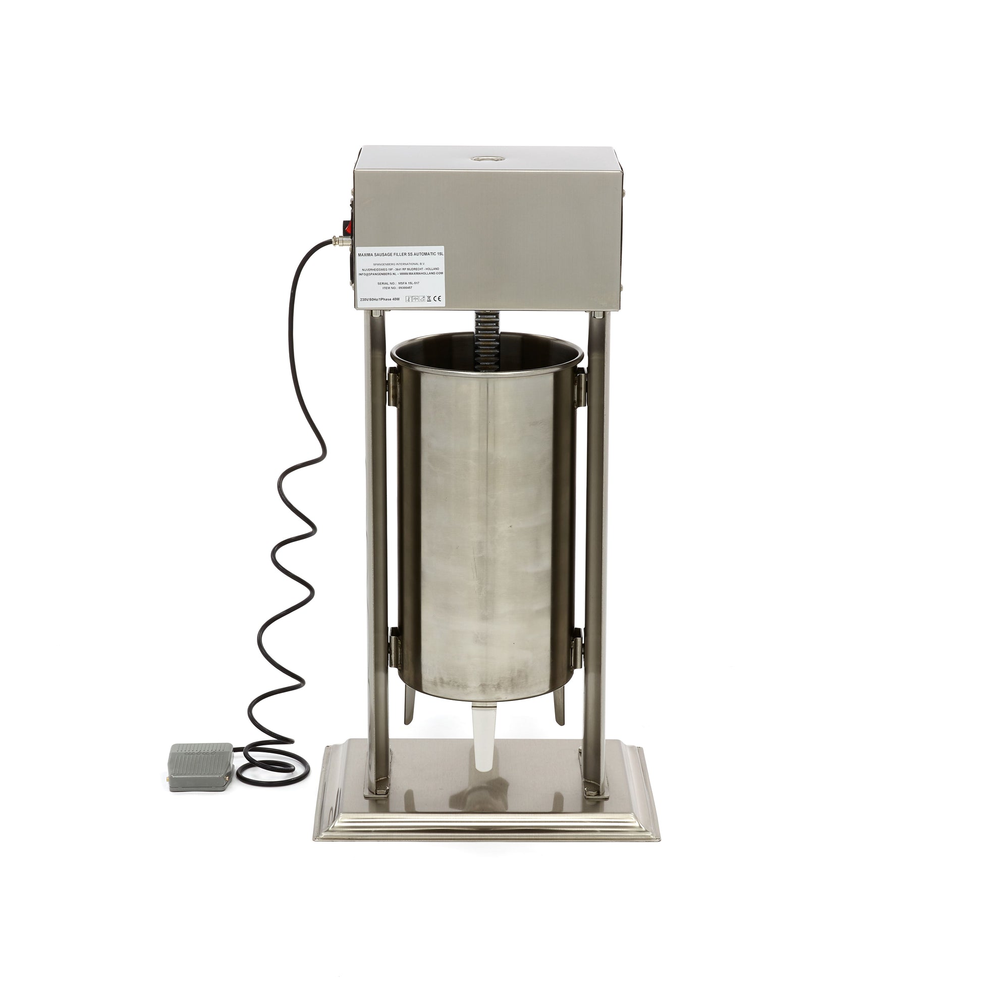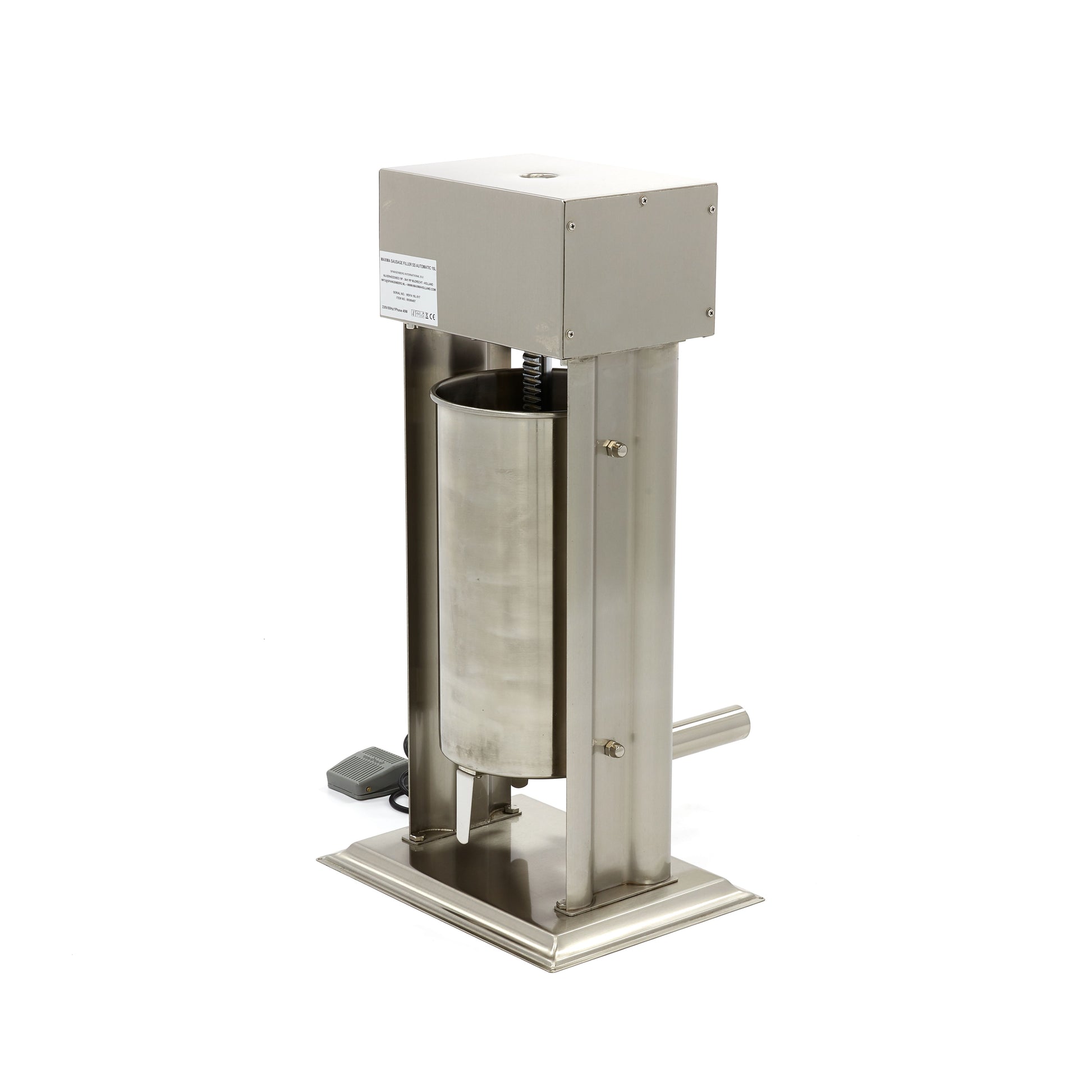 Fill your sausages quickly and efficiently with this automatic sausage stuffer with a filling capacity of 15 litres. This professional sausage stuffer is made entirely from stainless steel and comes with four filling tubes of 16, 22, 32 and 38mm diameter. You will also receive a foot pedal to operate the sausage filler so that you have your hands free to efficiently fill and turn the sausages. The pressure plate has a hole for venting and is sealed with a seal. This way, as little air as possible enters the sausages during rotation. The sausage stuffer can run at ten different speeds so that you always have the right speed you need for perfect dispensing.