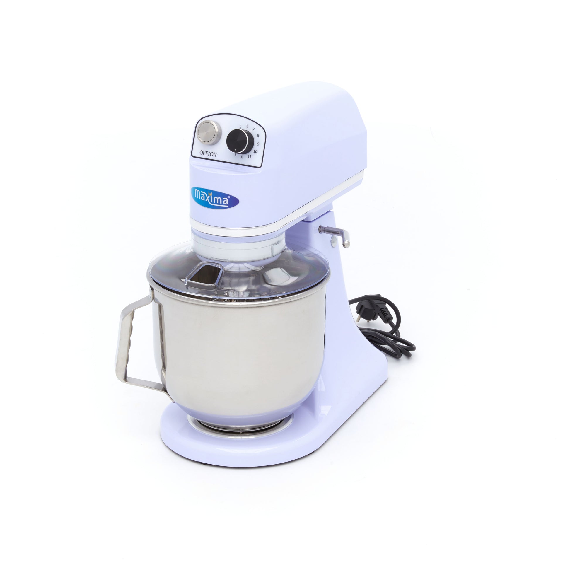 This professional planetary mixer is very simple and convenient to use. A lever opens the mixer making it easy to remove the mixing bowl or change accessories. The head of the device is equipped with a safety switch so that the machine automatically stops when the head is lifted. Switch it on and off with the separate start and stop buttons. To prevent the moving parts from being touched during operation, the product is fitted with a plastic protective cover. You can also add ingredients while kneading or mixing by means of the opening above the bowl. All individual stainless steel parts are dishwasher friendly.