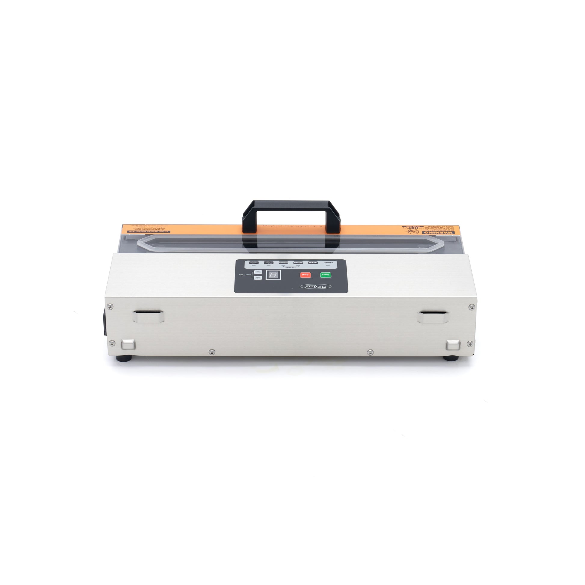 The housing of this luxury vacuum sealer is made from stainless steel. It can be cleaned with a damp cloth and a mild detergent. Do not use too much water to clean this device. The vacuum sealer stands on four rubber feet so that it stays in place when in use.